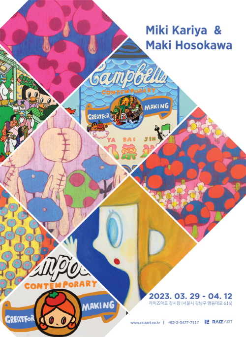 라이즈아트는 3월 29일부터 4월 12일까지 일본 작가 미키 카리야와 마키 호소카와의 2인전을 삼성동 라이즈아트 전시장에서 개최한다. 최근 들어 해외 미술 시장에서 높은 관심을 받고 있는 미키 카리야의 작품과 명화를 패러디한 이미지로 국내 미술 애호가들에게 익숙한 마키 호소카와의 근작들을 국내에 처음 소개하는 자리이다.