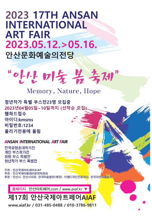 주최 : 안산국제아트페어AIAF 주관 : 안산국제아트페어운영위원회 행사명 : 제17회안산국제아트페어 ART ANSAN 2023 후원(예정) : 안산시, 안산시의회, 한국미술협회, 이엠디자인전문회사, 한국자연미술협회