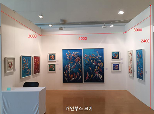 6. 부스 규격 부스 규격 : 높이는 240cm, 좌측 300cm, 우측 300cm, 전면벽 400cm 전시장 사정에 의해 약간의 변동이 있을수 있다. 캠퍼스 기준 10 ~ 15호 크기로 10점 까지 자유롭게 배치한다. * 전시장 사정에 의해 부스 크기는 다소 차이가 있을 수 있다.