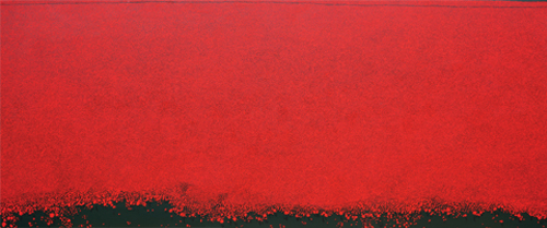 그런 힘찬 세상을 표현하기 위해 작가는 고채도의 색조를 선호하는데 가령 번트 움버 위에 레드를 넣거나 화이트 위에 핑크색을 덮는다거나 아니면 미디엄 마젠타나 버밀리언, 그린, 옐로 등을 깔아주는 식이다. 각 색깔은 다른 색과 대조를 이루면서 더욱 번뜩이는데 그것은 자칫 단조로울 수 있는 화면에 풍성함을 더해 주는 구실을 한다. 아무리 생각이 좋더라도 표현이 서툴다면 취지를 충분히 살릴 수 없을 것 이다. 그림에서 ‘언어의 조탁’은 가볍게 지나칠 수 없는 과제이다. 그렇기에 작가는 숲의 표현에 있어 자신만의 독특한 수법을 채택한다. 그의 그림은 자잘한 터치로 점철된 ‘점화’ 라고 해도 틀린 말은 아니다. 하늘에 별을 세듯이 작가는 나이프로 화면 구석에서부터 시작하여 점차 중앙을 향해 공간을 채워간다. 지칠 만도 하건만 신체의 리듬과 탄력을 살려 찍기 때문에 작업을 하는 순간에는 시간이 어떻게 지나갔는지 알지 못 한다고 한다. 또한 기계적 반복으로 그치지 않도록 방향과 세기, 크기를 각각 다르게 하여 물감을 펴준다.
