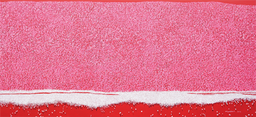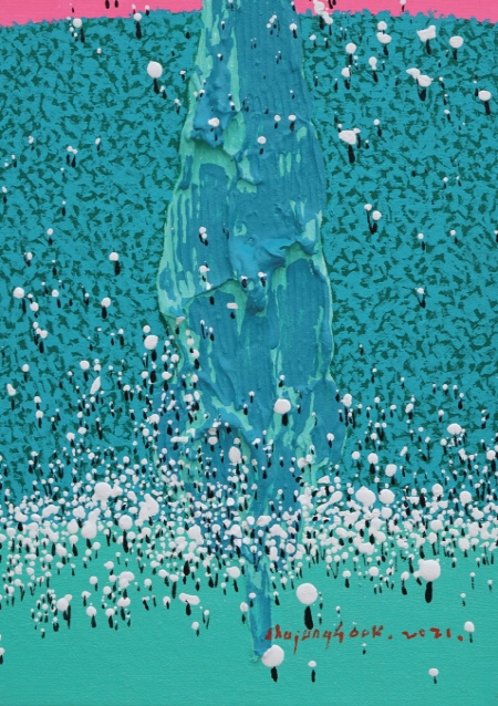 이렇게 무수한 점들은 다채롭게 변형된다. 터치가 겹쳐질 때도 있고 인접한 점과 맞물릴 때도 있으며 아래 점 위에 덧칠해질 때도 있다. 상호 관계 속에서, 즉 상응과 긴밀함의 역학 속에서 점화가 완성되어간다. 이렇듯 점과 점이 연결되고 소복히 쌓이고 엉키면서 조형의 리듬을 얻어가는데 바로 이런 리듬이 화면에 잔잔히 물결 치고 있는 것이다. 과연 작가에게 찍는다는 행위는 무엇을 의미할까. 그에 따르면 이런 과정은 마치 수양하듯이 자신을 정화하는 과정과 흡사하다고 한다. 찍는 행위를 반복한다는 것은 결국 자기 정화의 의미를 지닌다고 볼 수 있다. 찍는 행위를 반복하면서 과거의 회상에 젖기도 하고 아름다운 기억을 떠올리기도 하며 차분히 자신을 돌아보는 시간을 갖는다. 인간의 비극은 어느 한 순간도 골방에 있지 못한다는 파스칼(Pascal)의 말이 무색할 정도로 그는 자기 내면의 잠복을 통해 마음의 안정감과 평화로움을 얻는 것이다. 자기 성찰은 ‘하나의 삶’이란 점을 감안한다고 본다면 내면을 들여다보는 일은 더없이 중요한 일일 것이다. 다른 모든 삶과 마찬가지로 그것 역시 돌보지 않거나 뿌리가 뽑히면 병들게 마련이다. 자기를 돌볼 틈조차 없는 현대인에게 내면의 성찰은 영혼을 더 높은 곳으로 인도해 준다.