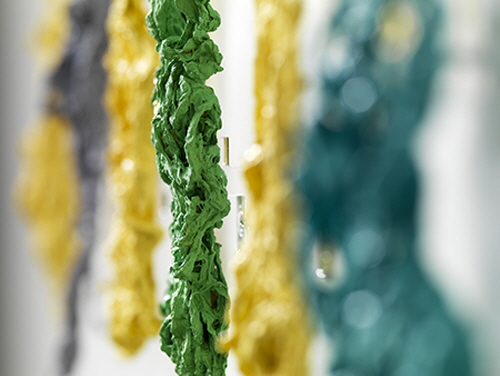 그리고 이후 닥 섬유를 만나면서 비정형적인, 유기적인, 그리고 우연한 형태는 극대화되고, 작가의 작업은 또 다른 전기를 맞는다. 주지하다시피 닥 섬유는 한지의 원료로서 균일한 조직을 가진 양지와는 다르게 그 조직이 균질하지 않고, 그 불안정성이 오히려 비정형적이고 유기적이고 우연한, 그러므로 어쩌면 자연(성)에 부합하는, 다시, 그러므로 작가가 추구하는 작업의 생리에 부응하는 면이 있다. 자연의 본성 그러므로 생명력이 오롯한 경우라고 해야 할까. 실제로도 사람들은 한지를 살아 숨 쉬는 종이라고 부르는데, 그저 수사적 표현만은 아닐 것이다. 여기에 작가는 생명력이 오롯한 자연을 매개로 살아 숨 쉬는 조형을 만든다고 한다면, 그 역시 그저 하는 말만은 아닐 것이다. 보통은 닥나무를 빻아 삶으면 조직이 해체되면서 부드러워지고, 그것을 물에 풀어 채로 떠내는 반복되는 과정을 통해 한지를 얻는다. 여기서 작가는 한지로 가기 전 단계에서 상대적으로 더 거친, 닥나무의 질료가 살아있는, 그러므로 어쩌면 자연의 본성이 여실한 조직을 건져 올려 원하는 조형을 만드는데, 단품의, 때로 중첩된, 크고 작은 형태를 만든다. 비록 조형이 가능한 계기는 작가가 제공한 것이지만, 정작 조형을 완성한 것은 자연이라고 해야 할까. 그러므로 반쯤은 자연이 만든 작품이며, 작가와 자연의 합작품이라고 해야 할까. 그저 수사적 표현으로 보기보다는, 그만큼 자연의 생리에 충실하고 자연의 본성에 귀 기울이는, 작업에 임하는 작가의 태도로 보면 되겠다. 그리고 여기에 알록달록한 색깔이 덧입혀지면서, 때로 부분적으로 옻칠과 금박으로 장식되면서 작업은 생기를 얻고 활력을 얻는다. 자연에서 건너온 것들, 그러므로 바람이 부는 것도 같고, 하늘거리는 것도 같고, 숨을 쉬는 것도 같고, 수런거리는 것도 같고, 들뜬 것도 같고, 봄을 맞이하기라도 하듯 화사한 것도 같고, 만개한 꽃잎이 자기를 활짝 열어 생명력을 마구 발산하는 것도 같다. 그렇게 자연이 봄의 제전 그러므로 생명의 제전에 초대하고 있다고 해도 좋을 것이다.