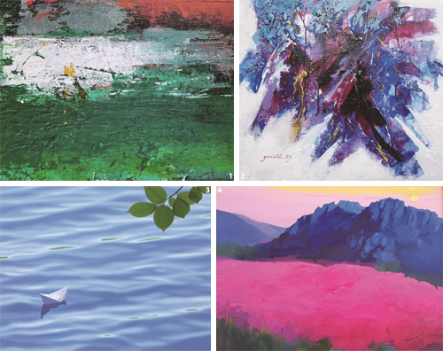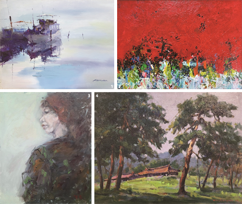 1. 김해령 作_사유하다_52x41cm_Mixed media on canvas 2. 김해진 作_은파_53.0x45.5cm_Acrylic on canvas 3. 김혜옥 作_종이배 띄우고_41x53cm_Oil on canvas 4. 남희자 作_새벽빛 진달래_53.0x40.9cm_Oil on canvas