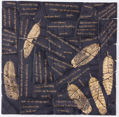 영원한 현재, 흙의 변화과정을 통해 표현된 순간시리즈(Piece of Moment) 도자 모자이크 위에 텍스트 오브제를 활용한 기억시리즈(Piece of Memory) 작품 전체에 전달하고자 하는 메시지를 테마로 도자조각에 텍스트를 오브제로 표현한다.