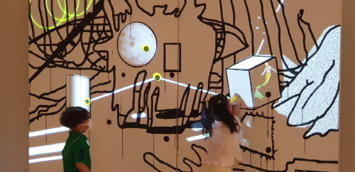 김태은 作_행성 트래킹_전도체잉크, 프로젝션맵핑, 터치보드, 인터렉티브 사운드_180x912cm_2021
