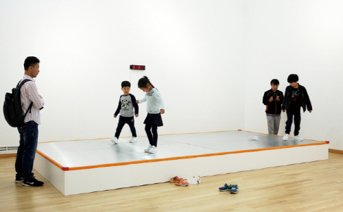 윤성필 作_Panta rhei 02_Aluminium plats, MDF Woods, Motor Magnets Timer, Shoes equipped with magnets Controll box_500x250x40cm_2016