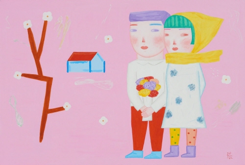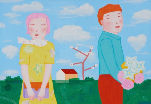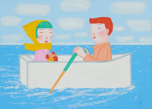 발그레한 볼, 알듯 말듯한 표정으로 쳐다보는 소녀, 그리고 특유의 서정성을 더해주는 정경. 이는 그의 작품 속을 관통하는 주제의식을 드러낸다. 영글지 않은 마음이 채 맺지 못한 첫사랑의 기억. 세월이 흐르고, 어른의 세계로 진입하며 순수한 감정은 매일의 일상에서 희석된다. 신철 작가는 눈가에 주름이 새겨지던 나이 즈음, 가장 순수했던 그 시절을 복기한다. 이는 곧 결코 잊히지않는 가장 소중했던 첫사랑에 가닿는다. 하늘과 물길이 맞닿아 끝없이 펼쳐지는 바닷가 마을의 코흘리개 소년이 부서지는 햇살 아래 해맑게 웃던 그 소녀의 미소에 잠못 이루던 그 순수의 시절은 슬프도록 아름답다. 다시 돌아갈 수 없기에 역설적으로 그 곳에 영원히 존재하는 신철의 시간 속에 머무르는 소녀는 봄이다.
