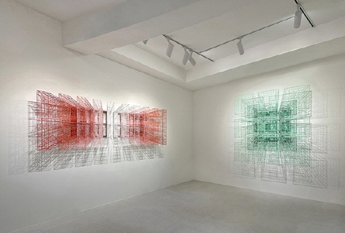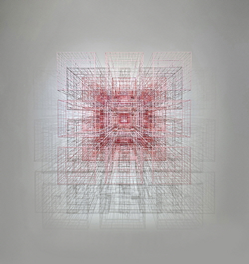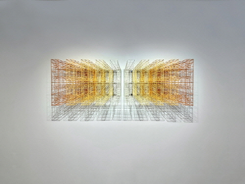 스틸로 만들어진 무수히 많은 선이 공간을 분할하고 경계를 형성한다. 수많은 선들이 교차하며 만들어진 공간은 위치와 각도에 따라 안과 밖의 경계가 모호하다. 이 모호한 공간은 작품을 바라보는이에게 정면을 보는 동시에 측면과 후면을 인식 할 수 있는 새로운 시각 경험을 제공한다. 관람자의 움직임에 따라 시야에 들어온 일부가 미래에 볼 것으로, 혹은 과거에 경험했던 대상이 됨으로써 인식의 확장을 유도하는 장치가 된다.