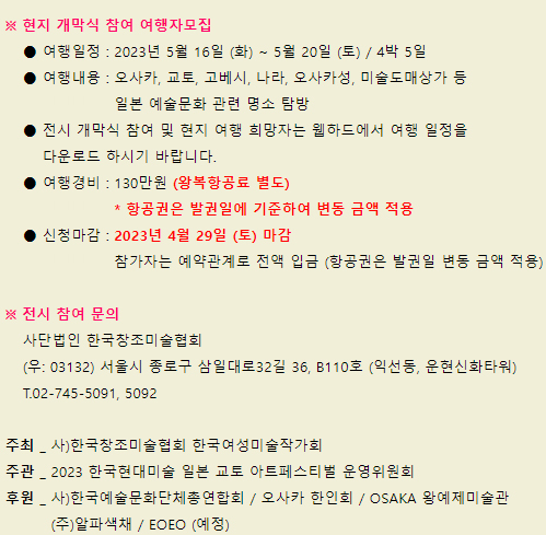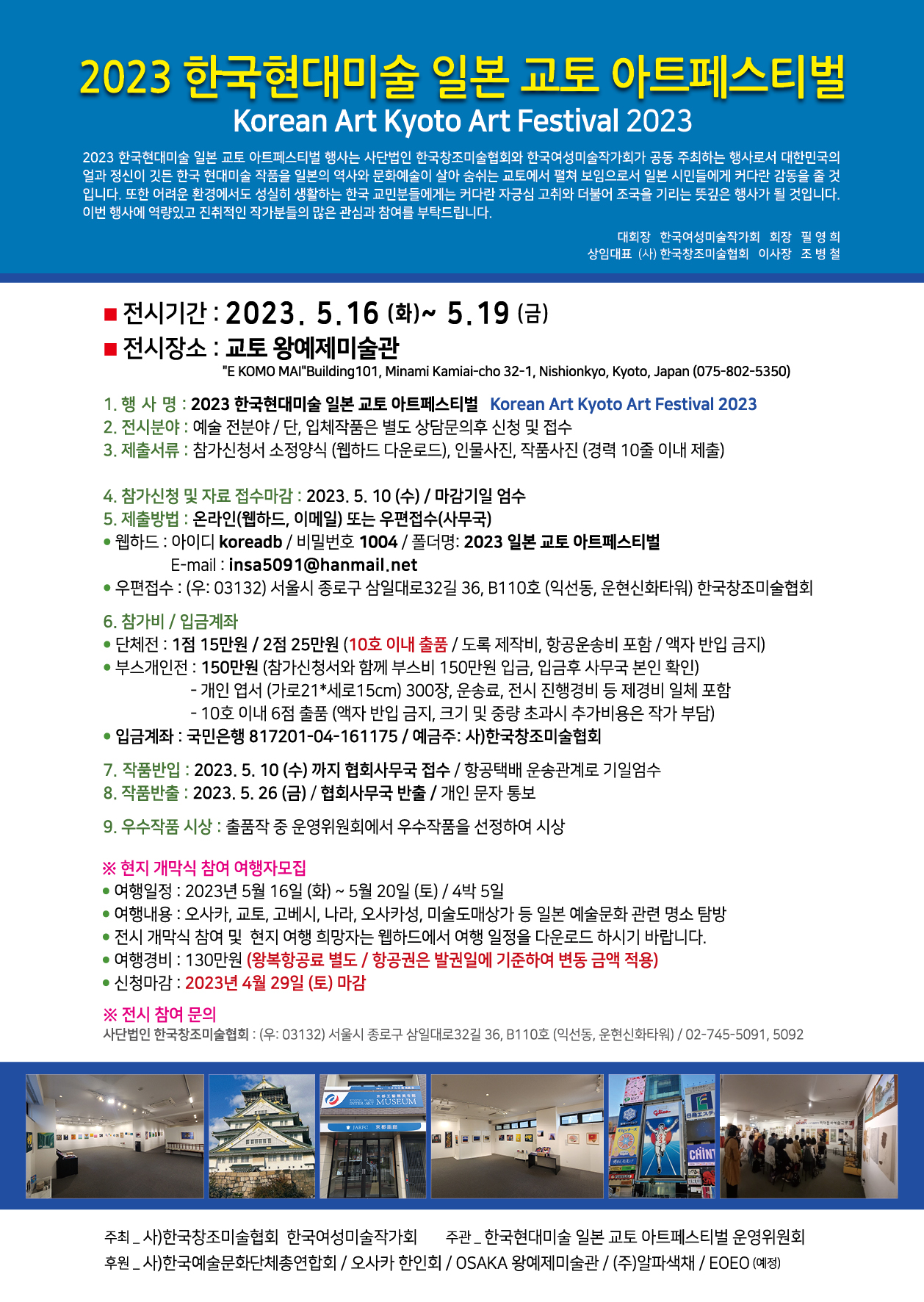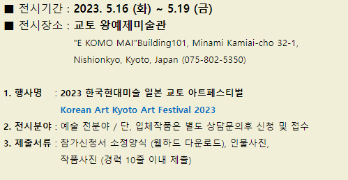 * 전시메일에 등록된 모든 이미지와 글은 작가와 필자에게 저작권이 있습니다. * vol.20230510-2023 한국현대미술 일본 교토 아트페스티벌 |