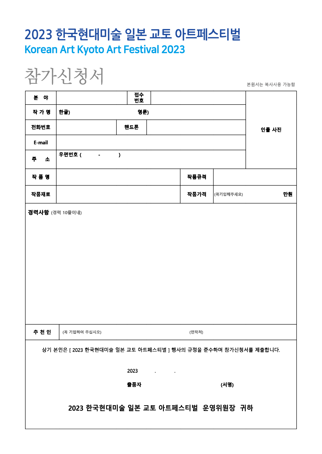 2023 한국현대미술 일본 교토 아트페스티벌 행사는 사단법인 한국창조미술협회와 한국여성미술작가회가 공동 주최하는 행사로서 대한민국의 얼과 정신이 깃든 한국 현대미술 작품을 일본의 역사와 문화예술이 살아 숨쉬는 교토에서 펼쳐 보임으로서 일본 시민들에게 커다란 감동을 줄 것입니다. 또한 어려운 환경에서도 성실히 생활하는 한국 교민분들에게는 커다란 자긍심 고취와 더불어 조국을 기리는 뜻깊은 행사가 될 것입니다. 이번 행사에 역량있고 진취적인 작가분들의 많은 관심과 참여를 부탁드립니다.