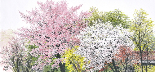 오용길 作_봄의 기운_80x170cm_화선지에 먹과 채색_2023