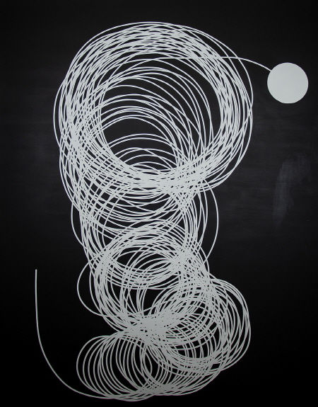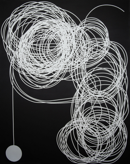 1. 균질하게 단색으로 마감된 화면 위로 일정한 굵기의 선들이 얽혀있다. 이 선들은 둥근 원형의 형상에서 풀려나와 유연하고 신속한 흐름을 유지하면서 뻗어나가고 있는 형국을 연출하고 있다. 테이핑을 해서 만든, 그린 선은 배경에서 빠져나와 어디론가 질주하는가 하면 마구 엉켜 있다. 실을 연상시키는 선은 그 무엇인가를 은유한다. 굴곡이 심한 마음의 상태이거나 복잡하게 연결된 인간관계 혹은 무수한 시간의 지층 아래 잠겨있는 감정의 결들 내지 몸에서 분출되는 여러 내면의 상태를 지시하는가 하면 눈에서 흘러내리는 억누를 수 없는 눈물이기도 할 것이다. 동시에 이는 전적으로 경쾌하게 미끄러지는 선의 맛으로 충만하다. 유기적인 선들은 원형의 상태에서 빠져나와 힘껏 중심에서 이탈해 나가면서 흥미로운 선의 궤적을 운율적으로 만들어나간다. 주어진 사각형의 화면 안에서 이루어지는 선의 흐름은 회화의 조건을 부단히 의식시키는 편이다. 선은 사각형 바깥으로 나가지 못하고 주어진 한계 안에서 그림을 만들어 보인다. 동시에 엄청난 운동력과 기운으로 그 틀을 요동치게 만든다. 한편 표면에서 선이 밀고 올라오는 듯한 연출을 보여주는데 이는 형상과 배경의 이원적 구조를 유지하면서도 배경과 분리되기보다는 그로부터 밀착되어 밀려 나오는 듯한 상황을 안겨준다. 화면 내부에서 실/선을 배출하고 있다는 느낌이다. 표면에 남겨진 깊이/공간이 화면을 용기처럼 다루고 있다는 인상도 준다. 이것은 물감을 흠뻑 먹인 화면을 만들고 그 위에 실을 얹혀 놓은 다른 작업에서 보다 두드러진다. 블랙과 레드 등 단색의 색면을 뒤로 하고 그 위에서 춤을 추듯이 이동하는, 출렁이는 선들은 여러 레이어를 만들면서 복잡하고 기세 있는 선의 몸을 단호하게 만들고 확고하게 새기고 있다. 종이테이프가 얹혀지면서 만든 이 선은 화면의 피부에 예민한 상태로 올라와 있다. 그리고 저부조의 선들은 촉각적인 감각을 그물처럼 펼쳐놓는다. 선의 교차와 겹침에 의해 피부에 얇게 패인 공간이 만들어지면서 균질한 표면으로 보이는 화면에 미세한 변화를 만들어내고 있다. 실제로 실타래에서 풀려나온 선들은 자립하지 못하고 중력의 법칙에 의해 아래로 처지거나 드러눕는데 반해 이 그림에서의 선들은 표면에서 굳건하고 강직한 실/선을 응고시켜 놓은 상태가 되었다. 시간이 정지되어 있는 존재의 한 순간이 연상되기도 한다. 가볍고 흔들리는 실들이 그림 안에서는 좁은 띠 혹은 테이프 자체가 되어 견고하게 부착되어 있다는 느낌이다. 실/선의 존재감이나 실존성도 강하게 어필되는 편이다. 그런 면에서 이 실/선은 작가의 실존을 대리하고 자기감정이나 마음의 결. 눈물의 여러 경로를 누수하면서 진행되고 있다.