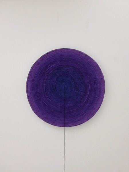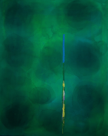 2. 작가의 또 다른 근작은 색면 추상에 유사한 화면과 그 화면의 중심부에 박음질로 고정된, 뜨개질로 만든 실의 물질성이 강조되어 그 오브제가 매달려 있는 작품이다. 이 작업은 앞서 언급한 드로잉과는 차이를 지니고 있다. 우선 린넨의 캔버스 자체가 두툼한 두께를 지닌 쿠션의 지지체로 바뀌었다. 따라서 화면 자체가 물리적인 부피감을 지니며 팽창되어 있다는 인상을 주고 있고 그만큼 부풀어 오른 천의 오브제성이 강하게 인지된다. 캔버스 자체가 용기가 되어 물감을 흡수하고 빨아들인 어떤 상태성을 암시하는 화면이다. 린넨이 지닌 질감과 색채를 작가는 즐겨 다루는데 따라서 약간의 굵기를 지닌 올과 천 자체의 색감에서 연유하는 부드럽고 자연적인 맛을 중시한다는 생각이다. 린넨의 색감과 질감은 그 위에 스며들어가는 물감의 상태와 긴밀히 연동된다. 작가는 린넨의 화면 위로, 안으로 수십 번의 칠을 통해 물감을 서서히 스며들게 한다. 선염기법으로 형성된 색은 화면 전체를 은은하게 적시기도 하고 수평의 띠처럼 밀고 나간 붓의 궤적에 의해 결을 만들기도 하고 바탕 위에 또 다른 색의 얼룩들이 부유하는 형국을 만들기도 한다. ‘발색과 감정이 좋은 느낌’을 주는 색, 색의 상태를 작가는 선택하고 연출한다. 자연스럽고 포근한 맛이 우러나오는 상황을 중시하는데 이는 작가에 의하면 “폭닥한 느낌”을 자아내는 것이다. ‘폭닥하다’는 ‘포근하다’의 방언이다. 청각적으로는 ‘포근하다’는 표현보다 ‘폭닥하다’가 더 효과적인 수사가 되고 동시에 입가에 맴돈다. 작가는 가능한 기름기가 ‘쏘옥’ 빠진 상태와 느낌을 원하는데 이는 아마도 담백한 것, 담담하고 자연스러운 것 등에 가까운 맛일 것이고 이는 우리 전통미술과 연계되어 한국적인 현대미술을 추구하려는 일련의 작가들이 공통적으로 언급하는 모종의 상태, 감각과 연결되어 있다. 예를들어 김환기, 윤형근의 일련의 추상 작업 역시 담백하고 푸근한 맛, 자연스러운 상태를 동경하면서 이루어진 것이기도 하다. 린넨 천이 지닌 자체의 색감과 질감, 그리고 그 위로 홍건하게 차오르는 물감/색은 폭닥한 느낌을 자아내는 상황 연출에 겨냥되어 있다. 동시에 작가는 색으로 물든 추상의 화면 위에 구체적인 물질인 실을 뜨개질하고 박음질했다. 일정한 매듭을 지으며 아래로 내려오는 실은 화면을 채우고 있는, 따라서 화면과 분리될 수 없는 색채들과는 달리 화면 위에 존재하지만 풀어진 실들은 바람이나 공기의 흐름에 의해 유동적인 존재가 되어 흔들린다. 뜨개질과 풀려진 실들이 바닥을 향해 드리워진 상황은 화면에 개입하는 외부적 조건, 타자의 영향력을 암시하는 한편 모종의 경계에 자리한 실의 운명을 상상하게 해준다. 실은 바느질로 인해 화면에 붙어있지만 동시에 그 위로 나풀대면서 흔들리는 실의 오브제성을 드러내면서 내, 외부의 경계에 자리한 실의 운명을 보여준다. 동시에 그 실은 눅눅한 배경을 등지고 빠져나와 하나의 실존적 몸, 또는 그 몸에서 흘러내리는 눈물이 되기도 한다. 두툼한 볼륨을 지닌, 덩어리의 표면에 부착된 실은 여러 가지 색채와 형태를 뼈마디처럼 간직하면서 바닥을 향해 내려오고 있다. 이는 습성의 생성적인 화면과 연동되고 맞물리면서 살아있는 존재가 되어 생명체처럼 꿈틀거리는 것이다. 눈물이 되어 흘러내리는 것이다.