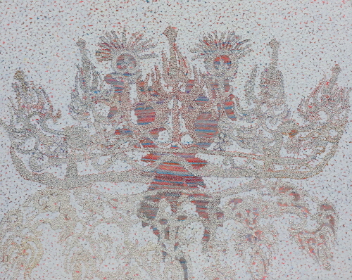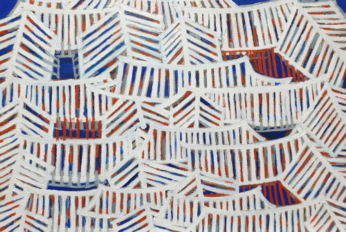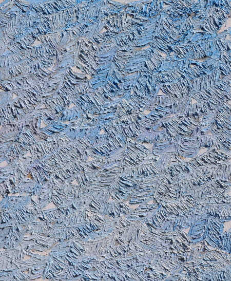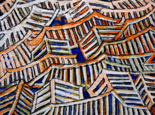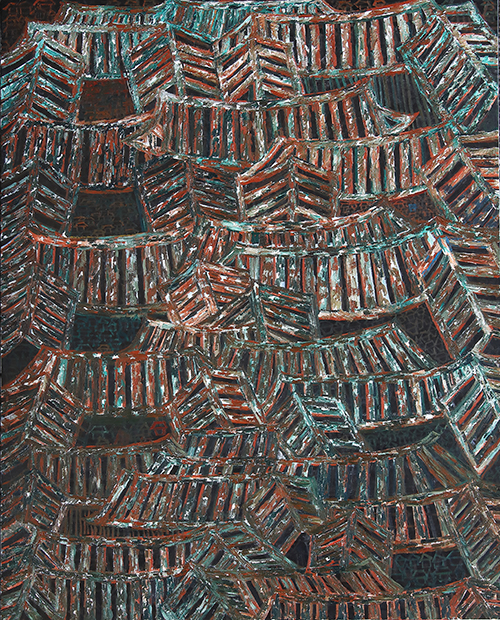 촉지적(haptic)이라는 말은 그리스어로 만진(touch)다는 뜻의 합테스타이(haptesthai)에서 유래한 것으로, 피부가 물체 표면에 닿았을 때 느끼는 촉감(tactile feedback)과 관절과 근육의 움직임이 방해받을 때 느껴지는 근 감각적인 힘(kinesthetic force)이라는 두 가지가 결합하면서 발생하는 경험의 한 종류이다. 2차원의 표면을 만지는 촉각의 작용이 자극을 평평하지 않은 다른 느낌으로 인지하게 하는 이러한 감각은 촉각적 교감으로 시작하지만, 종국에는 시각적 이미지라는 ‘상(像, image)을 형성하는데, 이때 우리는 가상의 실재감이라는 모순적인 경험을 하게 된다. 이와 같은 작용을 작가는 가장 전형적인 재료인 캔버스와 물감에만 의존하는 독특한 작업 방식으로 산출한다. 물감을 붓에 묻혀 캔버스에 발라 색으로 면을 만드는 방식 이외에 주사기에 물감을 담아 짜내거나 흘리기도 하고, 물감의 점성을 이용하여 캔버스에 댄 붓을 천천히 떼어내면서 물감이 부분적으로 딸려 나오게 하는 등 다채로운 색만큼이나 다양한 질감을 만들어낸다. 이 지점에서 화가의 그리기는 매우 노동집약적인 작업이 되고 동시에 행위의 흔적들이 물질의 중첩과 시간의 지연 같은 이질적인 것들을 접합시키는 묘한 어우러짐을 이루게 한다. 손을 뻗어 만지고 싶을 정도의 생생한 물성으로 가득 찬 작품의 표면은 다채색이라고 밖에 표현할 수 없을 정도의 화려한 색의 향연, 물감의 텍스처와 함께 지붕의 골격을 연상시키는 붓질과 기와 선들이 만들어내는 결들이 어우러진 입체적인 풍경이 되고 있다.
