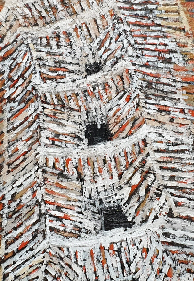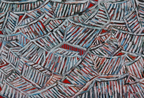 ‘기와’ 연작이다. 이들 작품이 본격적으로 등장한 것은 2016년 경이지만 기와로 대표되는 한옥에 관한 관심의 표출은 20여 년 전으로 거슬러 올라간다. 어린 시절의 기억과 결부된 집에 대한 아련함이 한옥이라는 소재와 결부된 것은 초기 작품 <동춘당의 봄>(2000년)에 잘 나타나 있다. 비록 서까래와 대들보만으로 기와의 존재를 드러내는 최근의 ‘기와’ 연작이 실물 기와의 부재(不在)를 통해 잃어버린 시간과 장소에 대한 그리움을 환기하는 것과 달리 이 작품에서는 처마, 지붕, 문틀, 돌담까지 사실적으로 그리면서도 마치 집 밖에서 안을 들여다보는 것처럼 대문 안에 또 다른 기와지붕의 문을 그리고 있어 겹겹이 둘러싸인 한옥의 공간적 특징을 잘 보여준다. 아마도 작가는 점진적으로 안쪽으로 들어가는 한옥 공간으로부터 무의식적으로 ‘겹’을 감지하면서 그리움이 자리하는 심연으로의 가능성을 찾아냈을 것이다. 이후 작가는 궁궐이나 한옥이 남아있는 지역들을 돌아다니면서 오랜 세월을 견뎌내는 묵직한 지붕의 무게감과 작은 조각들이 이어진 기와 선의 어울림이 만들어내는 묘한 매력에 빠져들었다고 한다. 그녀의 캔버스 안에서 집채보다 큰 지붕들이 모여 힘의 완곡이라는 하나의 흐름을 이루고 있다. 흐름을 뜻하는 우리 말 ‘물결, 머릿결, 나뭇결’이나 ‘한결같다’와 같은 표현에서 알 수 있듯이 ‘결’은 하나의 방향으로 멈추지 않고 지속하면서 생기는 무늬이자 세월을 기록해놓은 문양이며, 과거와 미래를 연결하는 시간과 기억의 고리들이다.