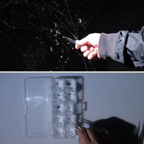 정덕용 작가노트 벌레들이 거미줄에 붙어 죽어있다. 추위를 이겨내고, 살아가기 위해 거미가 모아놓은 죽은 벌레가 모여 있다. 모여 있는 벌레를 바라보며 연민의 감정을 느낀다. 한 마리, 한 마리씩 속박하던 줄에서 끊어낸다. 줄에서 끊어낸 죽은 벌레를 영안실과 같은 작은 함에 안식시킨다. 죽은 벌레는 거미의 배로 들어가는 것이 아닌 인간만의 것으로 여겨지는 장례의 대상이 된다. 작가는 ‘우리는 어디에서 연민을 느끼고 있는지, 혹은 우리의 연민의 형태는 어떠한지’에 대한 의문을, 각기 다른 두 개의 화면 안의 시간이 정지되고, 재생되기를 반복하는 영상을 통해 제기한다.