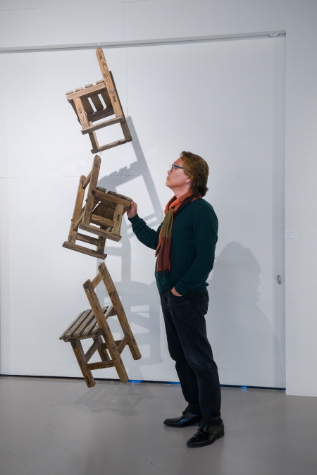 I. 김동석의 주요 작품 중 하나인 <길…어디에도 있었다> 연작은 여행길에서 우연히 만나게 된 ‘길’을 소재로 한 모노톤의 풍경이다. 그러나 외경을 옮긴 것은 아니다. 삶의 소중함, 그 속향은 밑줄을 긋기에 충분하다. ‘씨앗…1mm의 희망을 보다’가 그랬고 ‘우공이산(愚公移山)’이 그랬다. ‘석과불식(碩果不食)’도 매한가지였다. 이처럼 작가 김동석은 1996년 ‘어머니의 사계(四季)’를 주제로 첫 개인전을 연 이후 오랜 시간 인간 삶의 고난과 역경 속 싹트는 생명과 희망을 그렸다. 삶의 의지와 꿈의 가능성을 녹여냈다. 조형방식은 어떠한가. 회화와 설치를 넘나든다. 다양하고도 정감 어린 문법은 학제 간 장르 간 경계 없는 동시대미술의 흐름과 결을 같이 한다. 시간이 흐르면서 김동석의 작업은 깊이를 더했다. 화면엔 존재하는 것과 존재하지 않는 것, 실제 하나 실제 하지 않는 것이 나란히 놓였고, 점차 시각에서 정신으로, 외형의 화려함이 아닌 본질을 향한 채 사유의 영역을 개간하는 방향으로 나아갔다. 실제 그의 작업은 영원성과 순간성, 생성과 소멸이 하나의 화면에 그리드(Grid) 되며, 보이는 것이면서 보이지 않고 볼 수 없는 것이지만 볼 수 있는 것으로의 노정을 읽게 한다. 어떤 이목과 시선에도 개의치 않은 채(조형의 극적인 변화에 혹자는 놀라지만) 나름의 스펙트럼을 지향하고 있음 또한 명징하다. 그리고 그러한 흐름은 지난 2022년 11월 16부터 21일까지 진행된 G&J 갤러리 인사아트센터의 개인전에서도 발견된다. ‘일수사견(一水四見)’을 주제로 한 해당 전시를 통해 작가는 존재와 존재의 지점들을 저마다의 관점에서 영토화 할 수 있도록 했다. 그건 사물을 그리는 게 아닌, 애지(愛知)의 관점, 철학적 태도로 눈에 비친 사물의 외형을 뛰어 넘어 우리를 온전히 새로운 사고의 무대로 이끄는 작업에 가까웠다. 그야말로 행간이 넓다. 일례로 ‘의자’를 위아래로 중첩시킨 그의 설치작업은 진짜와 가짜, 허구와 진실, 현실과 비현실 등의 상이한 가치들이 모호한 경계 아래 갈등한다. 이미지와 대상, 언어와 사고 사이의 필연적인 관계를 전복시킨다. ‘복숭아 씨앗’으로 만들어진 대형 설치작품은 씨앗이라는 오브제와 생명성을 효과적으로 빚었다. 전시장 한가운데 둥지 튼 이 작업은 그 자체로 다감을 유도하는 다의적 구조체라 해도 무방하다. 이중 의자 작업은 매우 현실적이기에 오히려 비현실적인 양태(그의 작업 특징 중 하나는 현실과 초현실이 교차된다는 것이다. 회화도 그렇다.)를 지닌다. 미풍에도 흔들리도록 한 이 작품은 보기에 따라 인간 삶의 욕망이자 시간의 층위와 갈음된다. 조명에 의해 일렁이는 그림자는 부질 없는 세월, 시간과도 무관하지 않다.(개념적으론 씨앗 설치 작업도 마찬가지다.) 세월이라는 나이테를 품은 시간에는 과거와 현재, 미래를 비롯해 작업 과정 중의 사유시간과 제작 과정에서 지나간 시간 그리고 이미지가 가지고 있는 스스로의 시간이 걸쳐 있다. 여기서 중요한 건 조형자체가 아니라 그 시간 안에 담겨 있는 ‘존재의식’이다. 작가는 이들 작업에서 시간의 개입이라는 순수한 정신적 기술(記述)을 통한 인식의 흔적과 사고의 과정을 보여준다. 빛에 의해 유동하는, 어쩌면 무의식적이고 몽환적일 수 있는 창작물이지만 존재의식은 그림자와 더불어 서사를 만드는 분동이다.