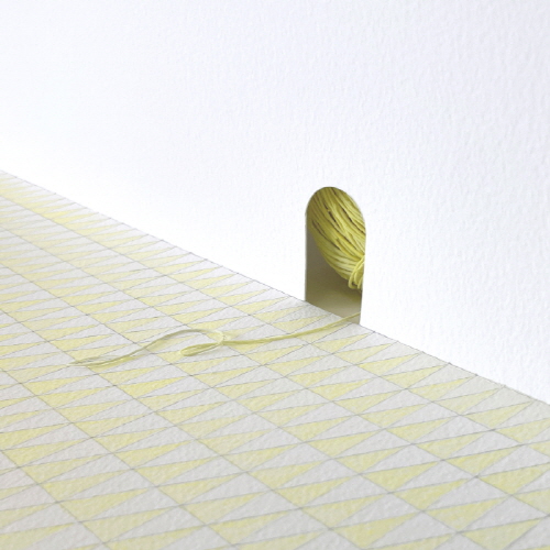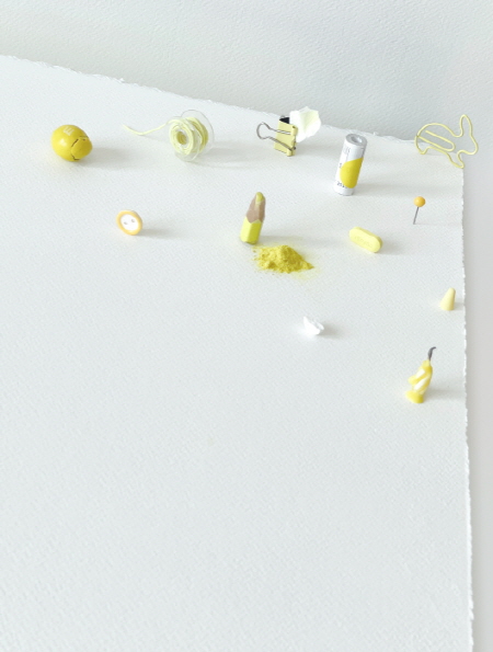 <비스듬히> 작업은 익숙한 것에 대해 다른 방식으로 보기를 제안하는 것이며, 생활에서 느끼는 불안과 치유에 대한 사유이다. 연노랑은 소심한 경고, 긴장을 자극하는 색이며 동시에 심리적 상처를 회복시키는 색이다. 흰색 종이를 연노랑으로 가득 색칠한다. 연노랑 변한 종이 표면을 책상 위에 놓여 있는 지우개로 본래의 흰색이 될 때까지 부지런히 손목을 움직이며 지운다. 아무리 지워도 색의 흔적이 남아 본래의 상태로 되돌릴 수 없게 된다. 이름이 모호한 색, 잃어버려도 언제나 대체할 수 있는 생활에서 쉽게 발견할 수 있는 사물들, 균형을 잃은 기울어진 화면을 통해 우리의 모습을 들여다보며, 그래도 괜찮아, 라고 전하고 싶다.