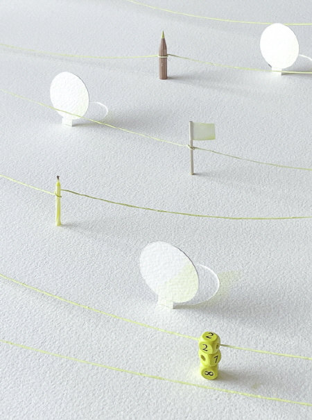 지우개로 지우는 행위를 반복하며 생긴 고무 찌꺼기를 이용하여 실을 만든다. 인내와 시간의 흔적인 고무 찌꺼기로 제작된 실타래들은 아슬아슬한 상태에 놓여 있거나 약간의 힘에 의해서도 끊어져 버리는 심리적인 방어기제의 모습으로 설치된다. 일상에 숨겨진 감응을 사물에서 발견하고 정교한 제작과정으로 재구성하여 다중적인 상징성을 부여하고 심리적 자극을 이끈다. 일상에서 목격하는 허술하고 쓸모없는 것에 대한 경외심을 드러내며 작고 연약한 것들의 소심한 위협과 방어의식을 통해 작은 것의 가치에 주목하게 한다.
