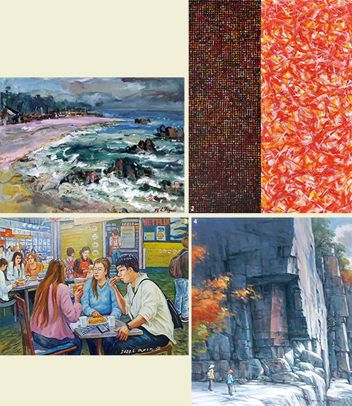 1. 이견 作_ 동해 형제바위_80.3x65.1cm_Oil on canvas 2. 민병각 作_memory 2022-27-Festivals_91.0x116.7cm_Acrylic on canvas 3. 문홍기 作_빈자떡(녹두전) 먹는 사람들_91.0x65.2cm_Oil on canvas 4. 정휘철 作_사인암_91.0x72.7cm_Oil on canvas
