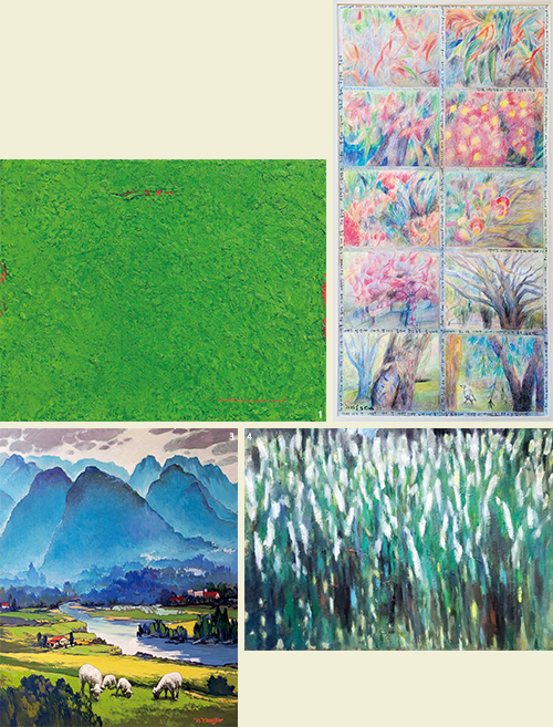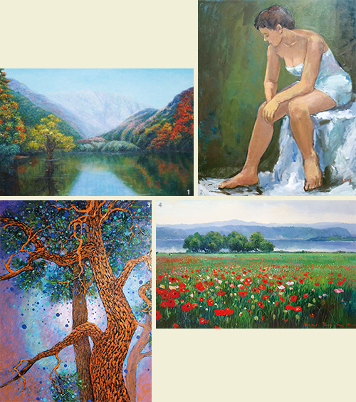 1. 오명원 作_lnto memory (어느 가을날)_116.8x91.0cm_Acrylic on canvas 2. 정정신 作_수원화성 방화수류정의 5월!_90.9x72.7cm_Oil on canvas 3. 조향순 作_여름_90.9x72.7cm_Oil on canvas 4. 기태희 作_Blossoming 1832_91.0x65.2cm_Oil on canvas