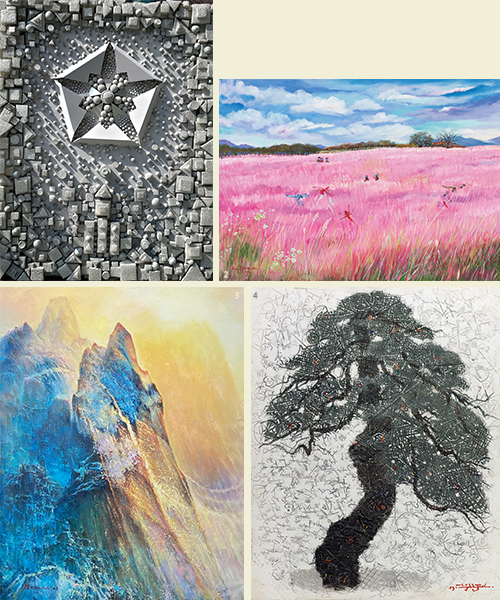 1. 조성호 作_무상22-9_100.0x80.3cm_혼합재료 2. 이길순 作_가을이 오는 소리_90.9x65.1cm_oil on canvas 3. 정지권 作_안데스산맥_116.8x91.0cm_Oil on canvas 4. 김종수 作_도시나무(urban trees)_90.9x72.7cm_Mixed media & Acrylic, Panel