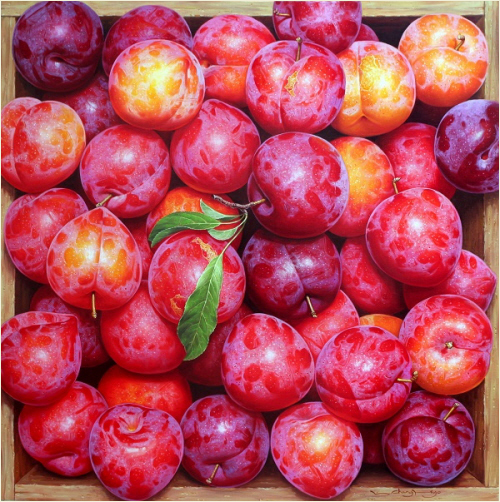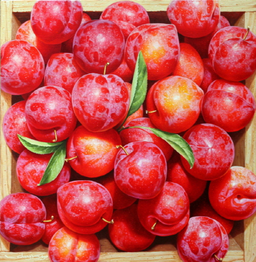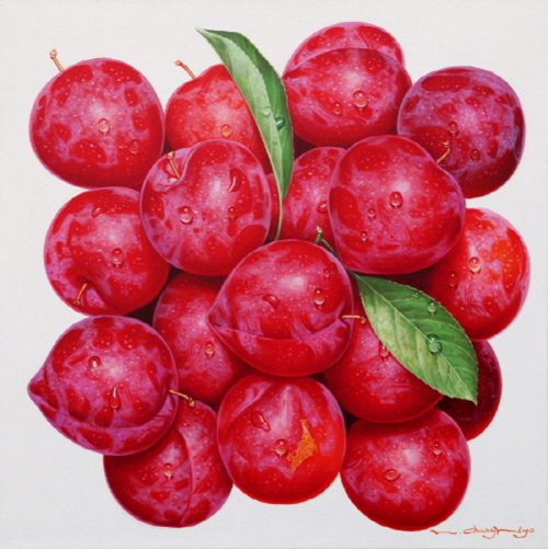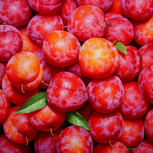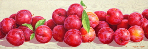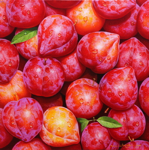 자두를 한 개 집으면 눈이 즐겁고 손이 행복해진다. 한 입 베어 물었을 때 쏟아져 나오는 그 형용하기 어려운 향기와 새콤달콤을 넘어서는 자두만의 독특한 과즙 그리고 속살의 느낌은 입 안을 즐거움의 향연, 축제로 만들어 준다. 빨간 맛. ‘여름의 맛’이라 하기에 전혀 부족함이 없을 정도이다. 자두의 새콤달콤한 맛은 행복한 기분을 느끼게 한다. 가득 찬 화면의 자두 또한 풍요로움을 주고 행복한 기분을 전해주며, 자두의 빨강색이 주는 느낌 또한 기분 좋은 행복함이다.