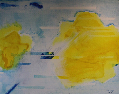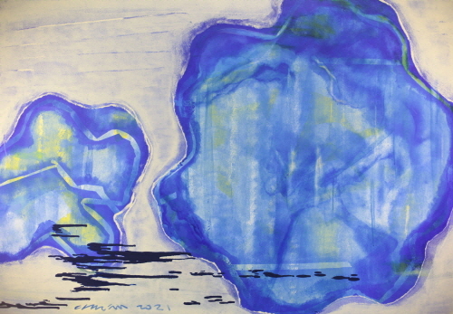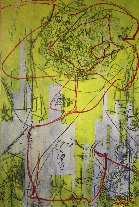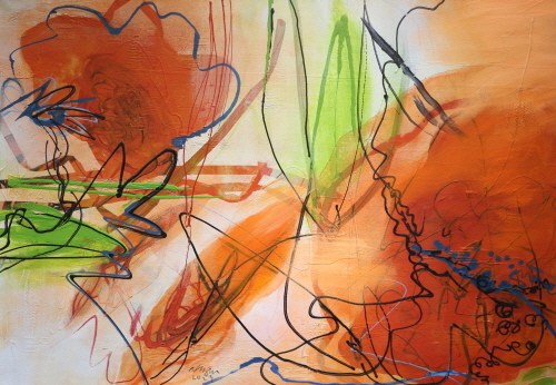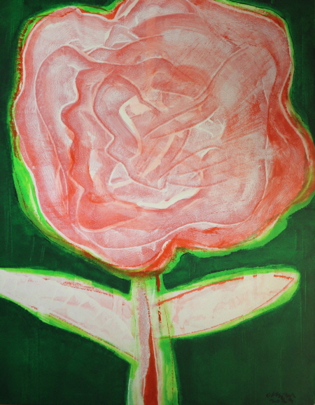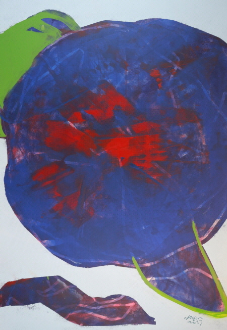 캔버스에 아크릴 물감을 수묵화의 선염기법이나 수채화처럼 다루는 작가는 우선 화면에 커다란 색채 덩어리를 자유롭게 풀어내서 원형에 가까운 형태를 슬쩍 안기고 그 주변에 몇 가닥 선묘로 줄기나 잎 등을 흘리듯이 그려놓았다. 시원스레 칠해놓은 물감의 자취가 얼룩지면서 커다란 원형의 형상을 안기고 그 내부에는 무수한 선들이, 붓질의 겹침이 포개져 있다. 활달하고 거침없는 필력과 대담한 색채 구사를 만난다. 묽게 번진 물감의 유동적인 상황성이 다채롭게 연출되어 있다. 원형의 형상과 배경 위로 급박하게 질주하는 듯한 선의 궤적이 또한 춤을 춘다. 전체적으로 홍건하게 스며든 물감들이 색채추상처럼 번진 흔적 위로 드로잉이 얹혀진 이 그림은 바탕에 침윤된 색채와 그 위로 떠도는 선들의 겹침 속에서 활기찬 기세를 보여준다. 구상과 추상이 혼재하고 색채와 선들이 결합하며 이미지와 질료가 공존하는 그림이다. 한 송이 꽃이 강렬하게 피어나는 어느 순간의 직관적인 포착이나 꽃의 존재감 내지 그것 하나로 품어내는 무수한 경지를 암시하는 듯도 하다. 전적으로 화면 중심부에 자리 잡은 모종의 꽃과 유사한 흔적에 시선을 집중시키고 그 주변에 펼쳐진 선들의 약동을 감지시킨다.