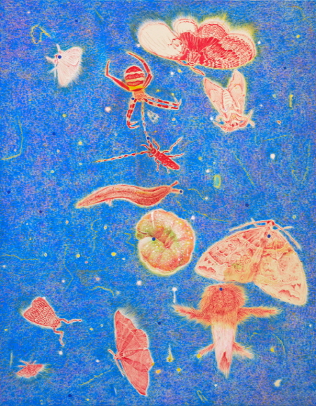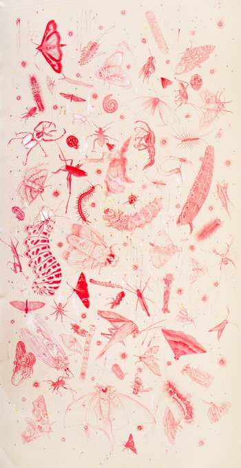 이번 전시는 나의 멋지고 묘한 벌레들과 구르는 콩 작업이다. 생 광목천에 사생하듯 그려진 100여 마리의 벌레들은 안성 미산리에서 만났고 낯설며 친숙하다. 처음에는 그야말로 뒤로 물러서게 만드는 ‘벌레’ 일 뿐이었다. 2011년 이후 한 발자국씩 가까이 들여다보니 어떤 벌레도 기기묘묘 대체불가 독특한 모양과 움직임을 가지고 있었다. 내가 발견하지 못한 생명들은 또 얼마나 많을 것인가. 어느 날 그 짧은 기간에 조금씩 안 보일 때 쯤, 줄어드는 나방의 숫자들을 헤아릴 때 쯤 기록하기 시작했다. 지상의 모든 형상이 거기에 있었다. 한 마리씩 낙하를 가늠하며 처음처럼 더듬어 가며 그려나간다. 너무 늦은 불안감의 몸짓이다.