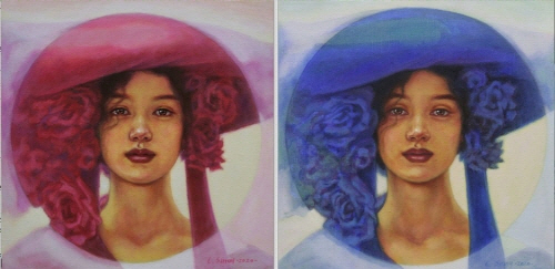 작품의 소재와 기법으로 보면 여성 인물을 소재. 구도는 거울 대칭(mirror symmetry)으로 도상을 간결하게 하고 조화와 균형의 미를 드러낸다. 섬세한 인물(여성)의 내재한 성격이나 미묘한 색의 변화에서 오는 풍부한 감성의 느낌으로 표현한다. 색은 자연에 구애받지 않고 자신의 감정이나 생각에 따라 창의적 감성의 색으로 표현하거나 색상의 밝기, 어두움. 온도와 마찬가지로 값이 다른 색상은 서로 대비되어 극적인 효과를 자아낸다. 레오나르도 다빈치의「회화론」에서 색은 색을 둘러싼 주변 색에 따라 다른 색으로 보인다는 말처럼.