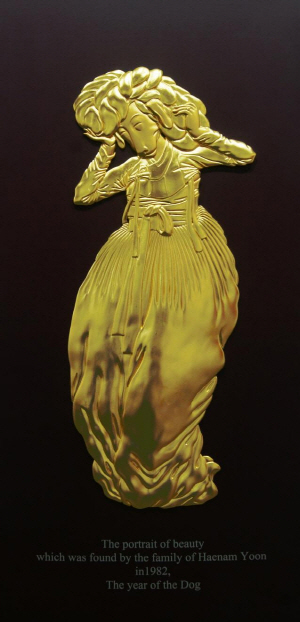 해남윤씨 집안에서 발견된 미인도(gold) 1982년 개띠해_66.2x129.2x10cm_ 캔버스 위 실사출력, 부조에 개금작업 금분(金粉) 금지(金紙), 단청작업_2016
