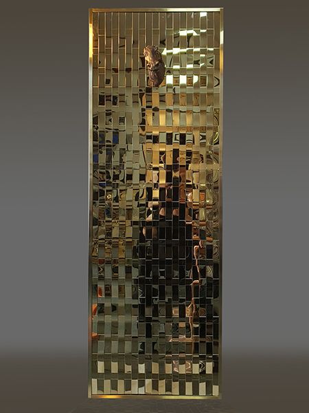 그리고 부가적인 어떠한 오브제도 없이, 기하학적이고 추상적인 패턴이 강조돼 보이는 화면 자체만으로 마감한 작업도 있다. 이번에는 오브제 대신 폴리싱 기법이 동원된다. 주지하다시피 금속은 빛에 반응하는 성질을 가지고 있고, 이러한 성질에 착안한 것이다. 광택 마감 처리한 부분과 별도의 마감 없이 최초의 질감 그대로인 부분을 대비시켜 차이를 강조한 것인데, 그 내용으로는 그 의미를 알만한 문자와 숫자와 기호들(이를테면 꿈과 같은)이 동원된다. 향후 작업이 더 섬세해지고 확장이 된다면 특정의 메시지를 함축한, 좀 더 긴 문장과 텍스트 작업도 가능할 것이다. 자신의 작업에 개념적인 장치며 의미론적인 측면을 도입하고 강조한 경우로 봐도 좋을 것이다. 금속은 빛에 반응하는 성질을 가지고 있다고 했다. 일종의 거울효과라고도 할 수가 있을 것인데, 작가의 작품 앞에 서면, 더욱이 광택 마감 처리한 부분 앞에 서면 작품을 쳐다보는 사람을 되비쳐 보여준다. 여기서 작가의 작업은 굴곡진 격자 모양의 모나드가 반복 확장되는 구조를 하고 있어서 전체적인 형상 그대로를 보여주는 대신, 절단된, 분절된, 부분과 부분이 잇대어진 불완전한 모습을 되돌려준다. 그 불완전한 모습이 우연한, 이질적인, 무분별한 타자들의 집합으로 구조화된 현대인의 초상을 보는 것 같다. 타자와의 얽히고설킨 관계로 구조화된 잊힌 초상에 이어, 또 다른 층위에서 현대인의 징후와 증상을 표상하고 있다고 해도 좋을 것이다.