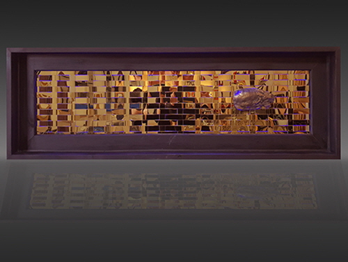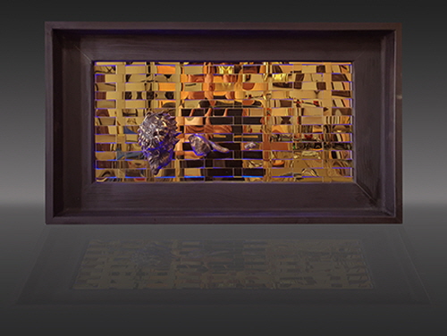 스테인리스스틸 띠를 엮는 방식이 불규칙적이고 비정형적이라고 했다. 이후 작가는 엮는 방식을 다르게 시도하는데, 방법이 다른 만큼 형식이며 분위기 또한 다른 작업을 내놓고 있다. 이번에 띠를 엮는 방식은 규칙적이고 정형적이다. 패턴이 두드러져 보이는데, 주지하다시피 패턴이 성립하기 위해선 하나의 모나드(단위원소)가 반복 확장되는 모듈 구조가 전제되어야 한다. 격자구조가 반복되면서 패턴을 형성하고 있는 경우로 볼 수 있겠고, 날실과 씨실이 교직 되면서 직조되는 직물 구조를 생각해봐도 좋을 것이다. 방법이 정형화된 것인 만큼, 그 방법을 통한 결과물 또한 마치 직물에서의 그것처럼 평면적인 화면으로 도출된다. 입체에서 평면으로 옮겨왔다고 해야 할까. 회화적 평면이 강조되고 있다고 해야 할까. 그러면서도 금속 띠 자체가 탄성을 가지고 있는 탓에 띠와 띠가 교직 되는 접 면에 굴곡이 생기고 틈새가 드러나 보인다. 현저하게 평면에 가까운 것이지만, 이런 굴곡과 틈새로 인해 화면은 섬세한(혹은 미세한) 저부조처럼 보인다. 그리고 작가는 일부 작업에서 화면 뒤에 LED를 장착해 조명을 부가하는데, 굴곡진 틈새로 은근한 빛이 새 나오면서 또 다른 분위기를 연출하고 있기도 하다. 조명이 있을 때와 없을 때가 사뭇 다른, 감각 혹은 시각 경험을 예시해주고 있는 것이다. 그리고 그 위에 이런저런 오브제를 부가하는데, 이로 인해 화면은 마치 회화에서의 그것과도 같은, 배경 화면이 된다. 물고기를 풀어놓으면 바다가 되고, 사자를 풀어놓으면 사파리가 되고, 나무를 풀어놓으면 숲이 되고, 도롱뇽을 풀어놓으면 습지가 되고, 유성을 풀어 놓으면 밤하늘이 된다. 그 위에 오는 오브제 여하에 따라서 배경 화면이 달라지는, 마치 움직이는 그림책과도 같은, 가변적인, 상황 논리가 연출되고 있는 것이다. 조각의 형식논리를 넘어, 조각에 이야기를 끌어들이는, 서사 조각 혹은 풍경 조각을 예시해주고 있다고 해도 좋을 것이다. 작가가 직접 주조해 만든 오브제들인데, 이로써 기하학적 패턴이 강조돼 보이는 추상적인 화면과 사실적이고 재현적인 오브제가 대비돼 보이는, 그리고 여기에 평면과 입체, 회화와 조각이 그 경계를 넘나들면서 합치되는, 그리고 여기에 이야기마저 함축된 이중적이고 다중적인 조각(아니면 작업)이 예시되고 있다고 해야 할까. 이로써 작가가 자기만의 형식과 방법론으로 조각을 확장하고 있다고 해도 좋을 것이다.
