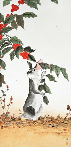 열매들을 가진 토끼_한지에 먹, 채색_72x35cm_2023