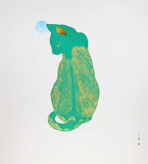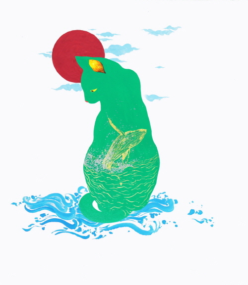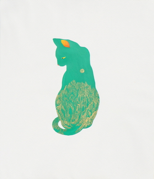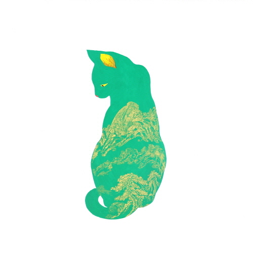 고양이는 일상에서 흔히 볼 수 있는 동물이지만 그림 속 고양이는 마주할 일은 그리 많지 않은 것 같다. 캔버스 위에 의뭉스러운 몸짓을 하는 고양이의 모습은 외로운 것 같으면서도 의연해 보인다. 박경묵 작가의 묘묘는 화폭 위에 홀로 앉아 있다. 오묘한 녹색의 묘묘는 그 안에 세상을 담고 있다. 홀로 앉은 고양이의 에메랄드빛 녹색이 감각적인 대비를 이루며 고양이가 몸에 담고 있는 동양화풍의 경관이 작품의 깊이와 의외성을 더해준다.