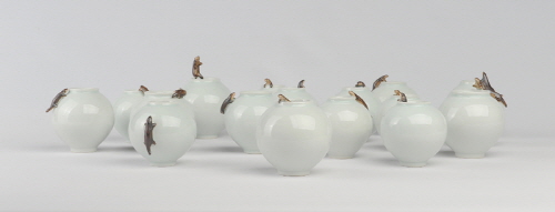 고향인 양구를 터전으로 도자 작업을 해오고 있는 장덕진 작가의 개인전 <Repair, Rest.>는 9년 동안 자신의 페르소나이자 작품의 소재였던 수달인 ‘덕수’를 떠나보내려는 시점에서, 새로운 변화를 겪는 과도기적인 휴식을 의미하고 있다. 작가는 깊은 산속 맑은 물에서만 사는 천연기념물인 수달을 소환하여 의인화하는 그간의 작업들을 통해, 수달의 형상을 빌려 다양한 인간상을 창조해내었다. 특히 2020년 코로나19 팬데믹이 상륙하였을 때에는 실제 마스크를 씌운 수달을 만들어, 시대적인 상황을 해학적인 코드로 접목하였다. 2022년 12월 처음 선보인 <나의 모양>에서는 수달의 탈을 벗은 작가의 얼굴을 제작하기도 하였다. 마치 그동안의 관객들과 만났던 수많은 덕수들이 수달이 아니라 작가 본인이라고 밝히고는, “속았지?”라고 해맑게 웃고 있는 듯 하다. 이때부터 작가는 덕수와의 이별을 준비하고 있었던 것 같다. 신작 애이불비(愛易不非)는 가면을 쓰고 있다. 한 손은 가슴에, 다른 한 손은 다가오지 말라는 제스처를 취한다. ‘속으로는 슬프지만, 겉으로는 슬프지 않은 척 한다’는 뜻을 지닌 애이불비처럼 속내를 드러내지 않으나, 새로운 만남을 향해 떠나갈 작가의 모습이 비추어 진다. 이번 전시에는 길고양이인 ‘고영희’를 형상화한 신작도 선보인다. “Repair, Rest.”라는 전시명에서부터 재정비와 휴식을 선언한 작가의 행보가 앞으로 어떻게 될지 짐작하고 상상해볼 수 있는 시간이 되지 않을까 한다. 깊은 계곡 수달이 도시에 놀러와 행복을 나누어 주었던 기억을 가지고 있는 관객들이라면 모두, 작가의 쉼표와 마침표 사이로 초대한다.