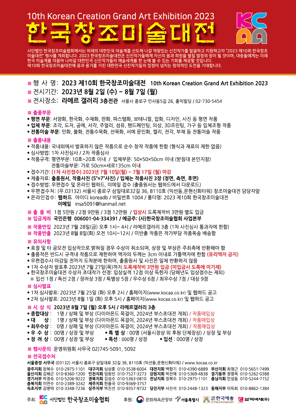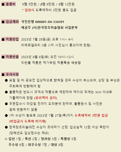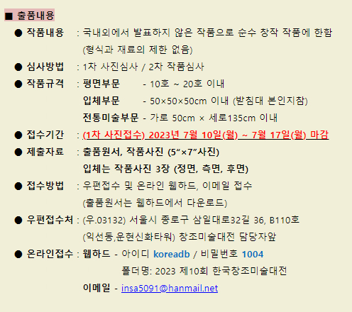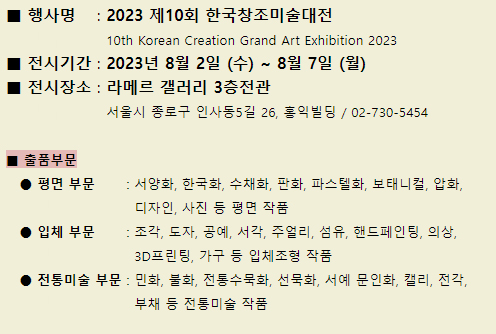 * 전시메일에 등록된 모든 이미지와 글은 작가와 필자에게 저작권이 있습니다. * vol.20230710-2023 제10회 한국창조미술대전 |