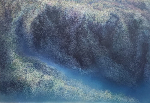 60대 염진욱 작가의 패턴화 된 ‘숲화’를 보면 작가에게 있어 회화의 본질은 노동집약적 그리는 행위라는 사실을 인정할 수밖에 없다. 중요한 것은 그녀의 그리는 행위가 붓으로, 그 붓은 다시금 색으로, 색은 숲의 형태가 되어가는 과정을 통해 자신의 존재가 드러낸다는 사실이다. 작가가 촘촘히 수를 놓듯 한 땀 한 땀 그려낸 단색조의 대형화면은 숲의 이미지로 표현되지만 노동에 천착한 작가의 창작행위이며 작가의 삶 그 자체를 드러내고 있다. 붓-노동이 화면의 흐름을 주도하여 탄생한 작품에서는 산맥을 따라 유유히 흐르는 운무, 천둥번개가 치고 난 후 햇빛에 모습을 드러낸 밝고 어둠이 대조적인 산봉우리, 칠흑 같은 어둠이 짙게 깔린 구름 속에 침잠한, 화면의 하단에서 상단으로 전개돼 어둠이 지배하는 화면의 공간이 공감을 풍요롭게 한다.