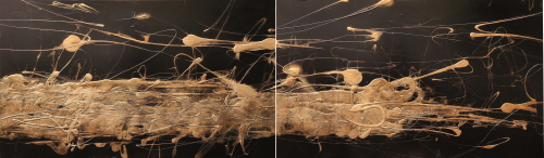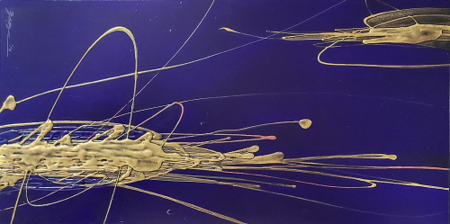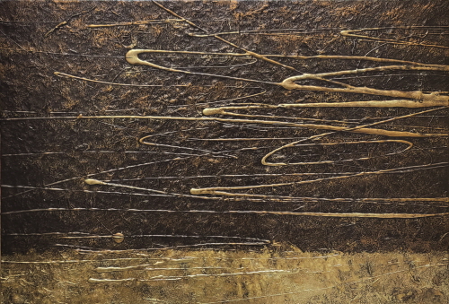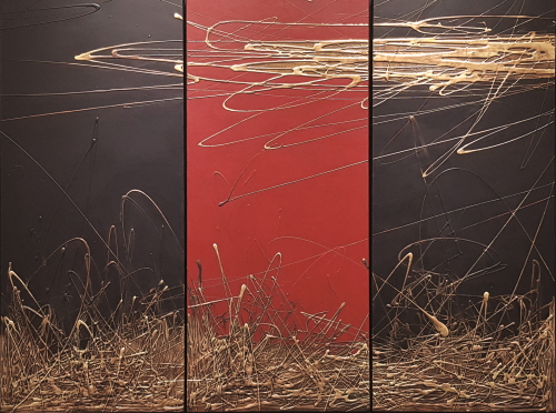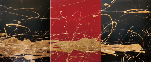 2010년대 중반부터 시작된 <Enter comunication 통신입력>이라는 명제의 작업은 컴퓨터 자판과의 연계성을 가지는 작업일 수 있다. 이 역시 세상과의 소통이라는 수단으로서의 의미를 상징화하고 있기 때문이다. 물감 또는 그와 유사한 재료를 캔버스에 흘리는 상태로 진행되는 드리핑 기법은 주목할 만한 조형적인 성과를 거두고 있다. 마치 부조처럼 평면에서 돌출하는 굵고 가느다란 선들이 리듬을 형성하면서 여러 가지 형태의 이미지가 만들어진다. 위아래로 진행되는가 하면 횡으로의 방향성을 가지는 작업이 있는가 하면 자유롭게 공간을 유영하는 듯싶은 불규칙성이 화면을 지배하기도 한다. 어떤 모양의 이미지이든 빠른 속도감을 가지는 선들과 반점 형태의 이미지들이 혼재하는 독특한 구조이다. 잠시도 멈추지 않고 단숨에 이루어지는 모양새를 가진 선들의 동세는 시각적인 흥을 유발한다. 아무것도 존재하지 않는 무한공간 또는 우주공간에서 일어나는 음파나 전파를 연상케 하는 다양한 형태의 파형은 조형적인 요건으로서 손색이 없다. 이 작업에서 중요한 것은 그 자신의 호흡과 신체적인 강약에 따른 다양한 파형이 만들어진다는 점이다. 이는 조형의 변주라는 측면에서도 긴요한 표현 방법이자 그 결과물이다. 평면에서 돌출하는 유연하고 자유로운 선은 금색이다. 짙은 어둠 속에서 명멸하듯 선명히 존재감을 드러내는 금색 선은 금이 가지고 있는 상징성과 함께 시각적인 흡인력을 가지는 색채이미지이다. 변치 않는 영원성과 부의 상징 이외에도 정제된 맑은 의식의 흐름을 의미하는 것일 수도 있다. 이렇듯이 세상과의 자유로운 소통을 매개하는 전자신호의 조형적인 해석인 그의 선 작업은 개별적인 형식미의 가능성을 고려할 수 있다.