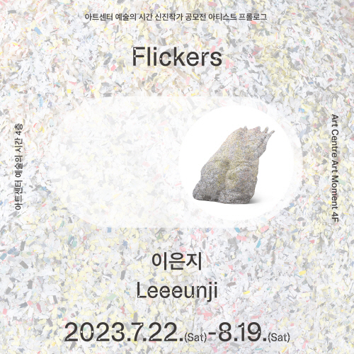 아트센터 예술의 시간은 오는 2023년 7월 22일부터 8월 19일까지 이은지의 개인전 《Flickers》을 개최한다. 이은지는 아트센터 예술의 시간 신진작가 공모 ‘아티스트 프롤로그 2023’의 선정작가 4인 중 하나로, 《Flickers》는 이번 공모 선정 릴레이 개인전 중 3번째 전시이다. 이번 전시는 빛이 깜박이듯, 희미하고 불분명한 허상을 주제로 대규모의 바위 풍경을 선보인다. 새롭게 선보이는 신작에서 이은지는 다른 재료들에 비해 상대적으로 유연하고 연약한 ‘종이’로 정반대의 단단하고 강인한 ‘바위’를 만든다. 이러한 행위는 ‘종이’ 매체에 관한 연구이자, 작가로서 창작행위의 지속 가능성에 관한 믿음으로 이어진다. 파쇄한 종잇조각이 거대한 바위 덩어리가 될 때, 종이―유약함, 바위―견고함으로 단정 지을 수 없게 된다. 작가는 종이 바위에 벌어진 틈이라든가, 전시공간의 건축적 요소들을 통해 관객의 시선 속에 여백을 의도적으로 노출하여 규정하는 행위들을 지연시킨다. 작가에게 틈(여백)에서 타오르는 불씨는 우리를 움직이게 하는 생성의 힘이자, 작가에게는 예술을 지속하게 하는 가능성의 힘이다.