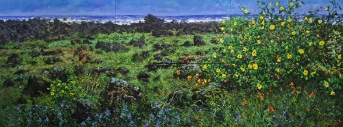 제주특별자치도와 (사)한국미술협회 제주특별자치도지회(회장 송재경)는 제주 지역에 국한되어 활동하는 작가 혹은 제주 출신 작가의 전시 기회를 확보하여 제주 미술 시장의 활성화를 위한 지원 사업으로, 제주갤러리 전시 대관을 공모한 바 있다. 올해는 11건의 작가·단체가 선정되었으며, 2024년 2월까지 제주갤러리에서 전시가 개최될 예정이다. 이번 전시는 고순철 작가의 작품으로 꾸려진다. 고순철(1968~)은 제주에서 활동하고 있는 작가이다. 그는 제주대학교 미술학부 서양학과를 전공하였다. 2004년 제주 청년 작가전에서 우수작가로 선정되었으며, 제24회 예총 예술문화상 공로상(2010)을 수상한 바 있다. 또한, 2019 제주도립미술관 10주년 제주작가 조명전 《99+1》, 아트페스타인제주 2021 《산지열전(山地展)》, 2021 문화도시 조성 서귀포시 공립미술관 공동기획전 《서귀포에 바람》 등 다수의 단체전에 참여하였다. 현재 한국미술협회 서귀포지부 지부장으로 활동하고 있다. 《소금정원(Salt garden)》은 “염생괴석 시간을 품다”는 주제로 해안가의 독특한 기암괴석과 염생식물(鹽生植物)을 작가의 시선으로 재해석하였다. 염생식물은 바닷가의 모래땅이나 갯벌 주변 등 염분이 많은 땅에서 자라는 식물을 일컫는다. 그는 제주의 해안사구와 염습지 등에 서식하고 있는 염생식물을 주제로 자신이 나고 자란 제주의 일상이자 주변 환경을 감각적으로 기록한다. 그는 강한 바람과 햇빛, 건조한 지표면, 염분이 높은 지하수 등 쉽지 않은 바닷가 환경에서 살아가는 염생식물을 통해 모든 것에 흔들리지도 좌절하지도 않으면서 괴로움·그리움·사랑·기다림 그리고 아픈 상처를 이겨낸 인고와 번뇌의 세월을 품은 어머니의 노동 시간과 공감을 담아내고자 하였다. 작가는 “척박한 땅에서도 바닥에 낮게 붙어 바람에 맞서지 않고 순응하며 자라는 땅찔레꽃은 제주 해녀의 삶과 닮았다”라고 말한다.