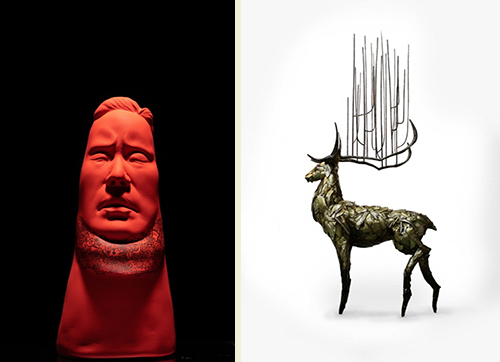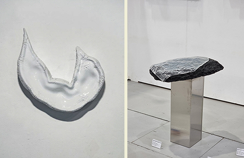 정진영 作_진통설_PLA_580x130x580(h)mm_2022 정창이 作_생명의 사리(舍利)_glass,stone,stainless_60x37x8cm_2022