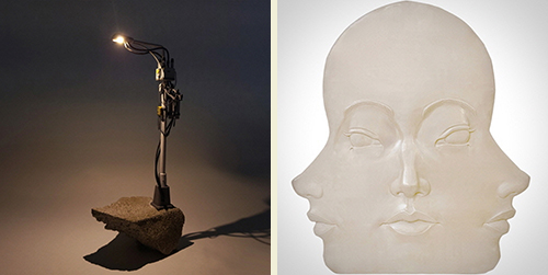 이찬주 作_불빛이 내리는 곳 3_PLA, 돌, 시멘트, LED_가변설치_2023 이한솔 作_'나'의 얼굴_FRP_700x610x50(h)mm_2023