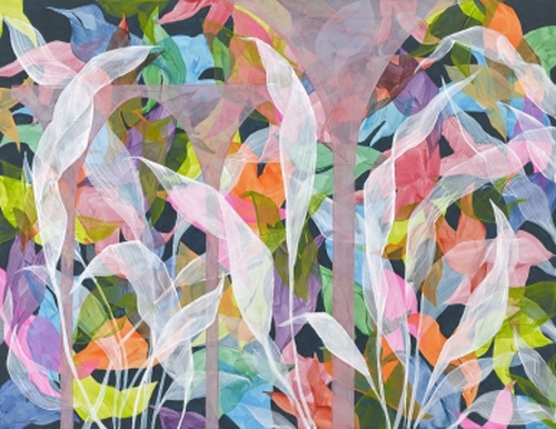 2012년과 2014년, 갤러리 도올에서의 전시를 위해 나는 기둥의 열주들로 가득한 공간을 겹치고 겹치며 < 공간의 적층 >을 그렸었다. 한 층 a layer 의 공간들은 어떤 기억들이였고, 그 위에 또 다시 올려지는 공간은 또 다른 어떤 시간이였다. 원근법의 교란, 건축물의 안 밖 공간의 뒤섞인 배열, 초 현실주의적인 그림자 서사 장치들이 층층이 공간으로 겹치며 이미지가 변형되고 결국에 어우러지는 모호하고 불가해한 환영은 내가 정의한 은유로서의 ‘시간’이자 ‘기억’ 그리고 사라지는 것, 즉 ‘부재’의 흔적이기도 하다. 시간은 기억을 중첩시키고, 욕망을 중첩시키고, 해석과 의미를 중첩시킨다. 그 중첩의 공간 안에서 개인의 신화와 내러티브들이 소근거린다. 바닥에 뿌리내린 기둥은 하늘을 향해 높이 오르며 양 팔을 벌리듯 좌우의 아치를 만들며 그 옆의 기둥의 아치와 만나 연결되고, 구조화 된다. 좌우로 벌려진 아치는 무언가를 향해 달려가는 손짓처럼, 혹은 목적처럼 길고 시원스러운 ‘호선 arc’ 의 조형미를 만든다. 그렇게 반복된 아치 기둥은 열주를 만들고, 경계이자 경계가 아닌 구획을 만들며 비실재적 상상의 공간을 만든다. 식물이미지는 연속선상의 이미지의 변주로서, 수없이 겹쳐진 잎새들은 나란한 기둥의 열주들과 다르지 않다. 잎새들은 마치 기둥의 열주처럼 산개하며 혹은 미시의 공간을 나누며 존재한다. 잎새들은 마치 각자의 언어를 풀어내듯 와글거리고, 자신의 그림자와의 공간을 침범하기도, 겹쳐진 공간 속에서 변형되기도 하며 스스로의 존재를 기호화 한다. 이것은 실재하는 식물의 묘사가 아닌, 식물 혹은 잎새를 닮은 환영이고 식물 혹은 잎새를 대상화하여 토로하는 감정이다.