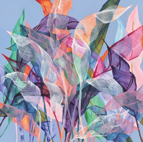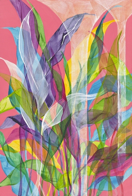 잎새와 잎새 사이의 공간에서 언어가 생겨난다. 그것은 감정이고, 기억이고, 흔적인 것처럼 중첩하며 속삭이듯 움직인다. 가득 채워진 밀도높은 언어는 시간과 공간의 간극을 컬러의 긴장이라는 조형요소로 채워버린다. 이파리의 뽀족한 끝매가 다른 잎새를 향해 길게 뻗은 조형미는 간절한 손짓 하나의 기억을 환기시킨다. 무용수들의 손짓에서 읽히는 다양한 감정의 기호들처럼, 바람의 방향에 눕는 잎새들은 다른 방향의 잎새의 이미지에 중첩되며 흔적이 사라지기도, 변형되어 붓질의 역동성으로만 남기도 하며 겹쳐진 공간 사이사이에서 ‘잎’ 이 아닌 ‘붓질’로 현존해 버린다. 그리고 결국 ‘이미지의 겹침\'으로 인해 만들어지는 몽환적 환영들은 오래된 기억과 꿈처럼 환영과 상상의 경계에서 모호해지고 투영된 이미지는 겹침으로 인한 이미지의 중복과 혼란을 불러일으키며 일종의 ‘변신 metamorphse\' 의 이미지가 되기도 한다. 이 상상과 환영의 공간 안에서, 기둥과 기둥의 아치가 닿아 교차하듯이 식물은 높이 뻗어오르고 기울며 아치 기둥과 같은 조형 구조를 파생한다. 기둥은 식물로 변주되고, 식물은 반복되며 기둥의 열주로 변형된다. 식물의 이미지, 그 줄기와 잎새는, 그러나 어떤 특정한 이름으로 불리는 화초가 아니다. 그저 한 편의 기억처럼 애매하고, 희미하며, 변형되고, 겹쳐진, 멀기도 하고 가깝기도 한 기억의 표상으로서의 식물이다. 건축물의 열주처럼 곧게 뻗은 줄기와, 한 자리에 뿌리를 내리는 식물. 식물은 자신이 뿌리를 내린 바로 그 자리에서 성장하고, 꽃을 피우고, 열매를 맺는다. 그리고 사라진다. 그것은 결국 은유로서의 ’시간‘처럼, 그리고 ’기억‘처럼, 사라짐을 예견한, 부재를 함유한 ’현존‘이기도 하다.