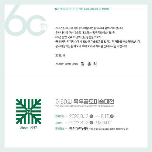 2023년 제60회 목우공모미술대전을 아래와 같이 개최합니다. 우리나라의 구상미술을 대표하는 목우공모미술대전은 60년 동안 국내 화단의 신인등용문으로서 국내·외의 각계각층에서 활발한 미술활동을 펼치는 작가들을 배출하였습니다. 공사다망하신줄 아오나 부디 오셔서 자리를 빛내주시길 바랍니다.