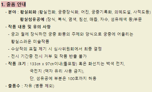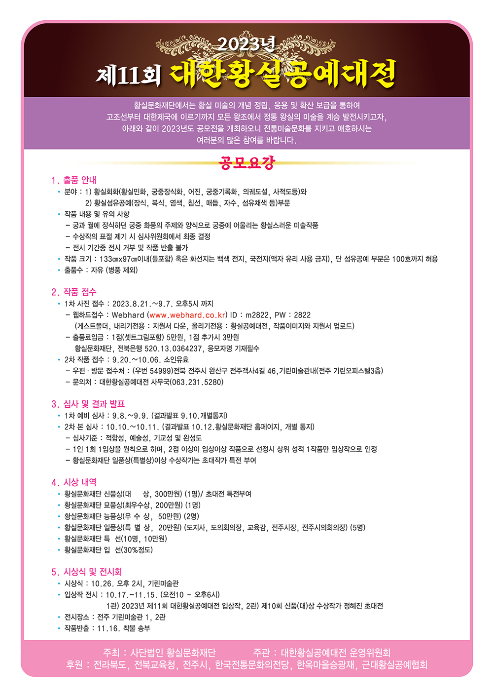 황실문화재단에서는 황실 미술의 개념 정립, 응용 및 확산 보급을 통하여 고조선부터 대한제국에 이르기까지 모든 왕조에서 정통 왕실의 미술을 계승 발전시키고자, 아래와 같이 2023년도 공모전을 개최하오니 전통미술문화를 지키고 애호하시는 여러분의 많은 참여를 바랍니다.