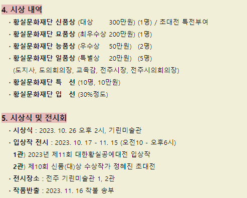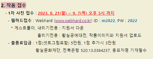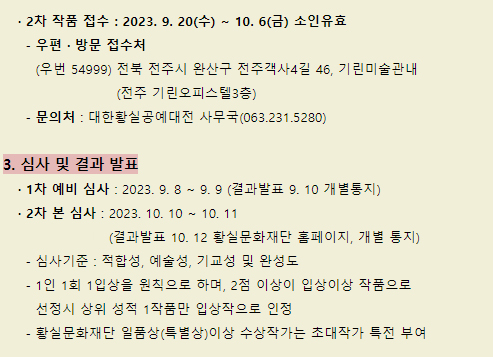 * 전시메일에 등록된 모든 이미지와 글은 작가와 필자에게 저작권이 있습니다. * vol.20230821-2023 제11회 대한황실공예대전 공모요강 |