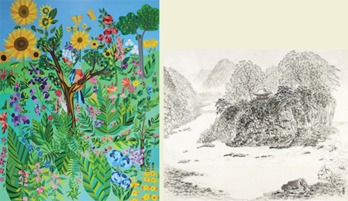 이다래 作_온갖 꽃들의 정원_162x112cm_캔버스에 아크릴_2023 이명상 作_금수정_160x130cm_한지에 수묵담채_2022