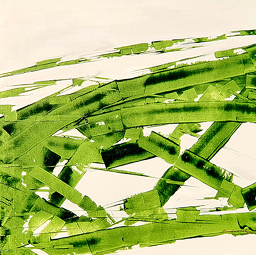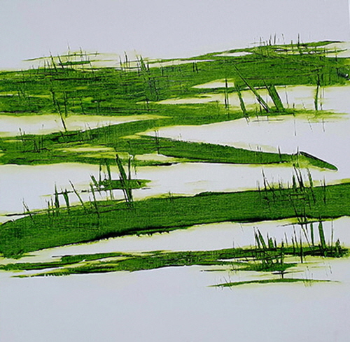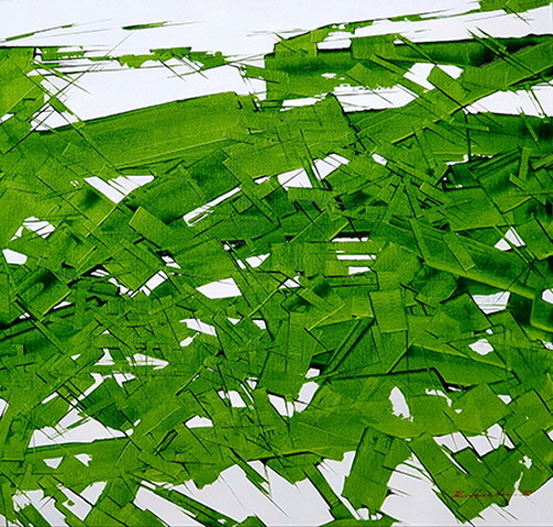 내가 예술이라고 부르면 예술이 되는 현대미술에서 예술성의 높고 낮음의 차원은 사라졌고 형형색색의 다양성과 개인성만이 병존할 따름이다. 따라서 작품에 대한 평론은 평가가 아니라 바라보는 감상자의 주관에 주어지는 대로 또는 작품 있는 그대로의 음미라고 생각한다. 이귀화의 작품을 마주대하기 전에 전시되는 그림들이 혹시 이전에 보았던 꽃그림이 아닐까 기대했었는데 의외로 또는 다행이도 너무도 흔한 주제인 꽃그림은 아니었다. 이메일로 보내온 몇 개의 그림은 자연 속을 거닐면 아무 곳에나 깔려있고 우리가 아무 생각 없이 밟고 지나가는 말그대로 잡초 또는 풀잎들이 무질서하게 널브러져있는 듯했다. 풀이 서있는 모습을 뒤러처럼 그렸다면 그것은 정물화나 풍경화였을 것이다. 그러나 그것은 전통적 의미의 회화가 아니라 한층 더 감각적이고 여러 감각들이 어우러진 공감각적인 통합감각적인 색면들의 추상적 건축술이었다. 풀냄새와 풀의 다소 깔깔한 촉감이 느껴지고, 풀의 나부끼는 낮은 음성, 더 나아가서 풀의 심장 풀의 슬픔이 묻어나오는 그림이다. 심지어는 이것이 풀이 아니라 녹색평면덩어리들로서 작가에 의해 요리되고 익혀져 그대로 보는 이의 가슴에 던져져 그대로 먹혀질 수 있는 추상적 점선면이라고 해도 과언이 아니다. 녹색은 명도로 볼 때 흑백의 중간에 위치하는 가장 평온한 색이고 칸딘스키에 따르면 너무 자족해서 움직일 필요가 없는 배부른 황소와 같은 상태이며 몬드리안이라면 지구상 어디에나 존재하는 비천한 색이며 삼원색이 아닌 중간색 비이성적인 색이라고 할지도 모른다. 이귀화의 그림은 평화롭고 온건하며 튀지않는다. 콜라주도 아닌 순수붓질 그리고 더군다나 사각이라는 전통적 평면틀을 유지하기 때문에 더더욱 온건해보인다.